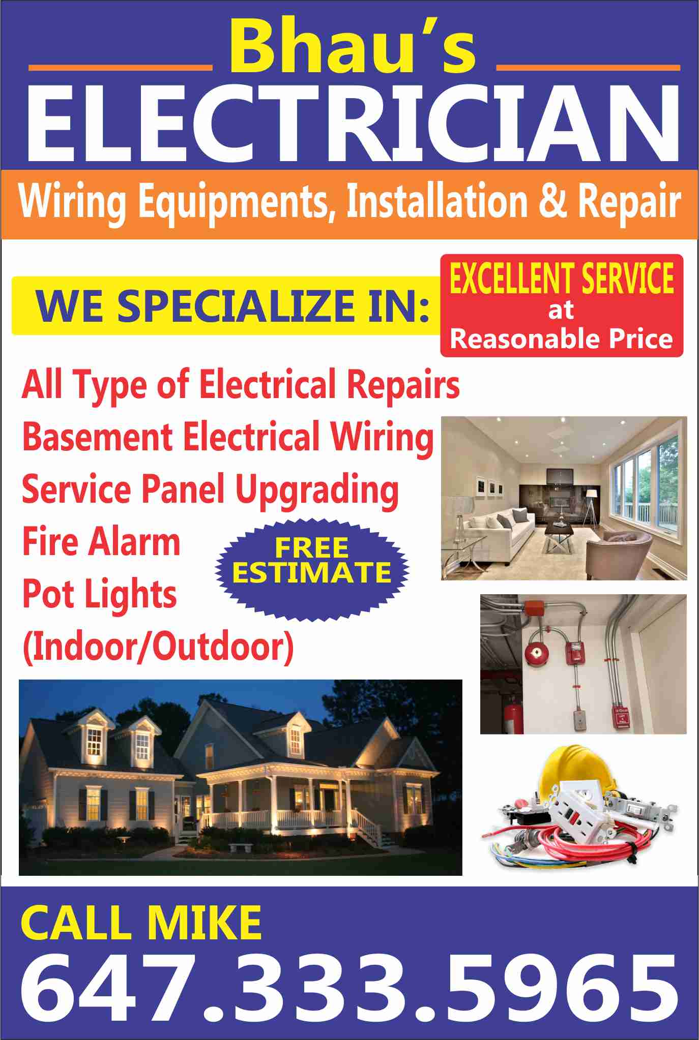 All type of electrical repairs Basement electrical wiring Service panel upgrading Fire alarm Pot lights (indoor / outdoor)