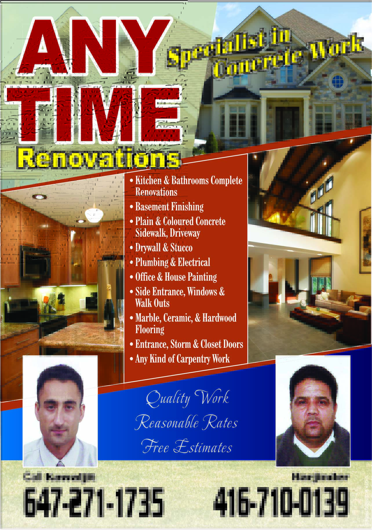 Kitchen & Bathroom Complete Renovations Basment Finishing Plain & Coloured Concrete Sidewalk, Driveway Drywall & Stucco Plumbing & Electrical Office & House Painting Side Entrance, Windows & Wal ...