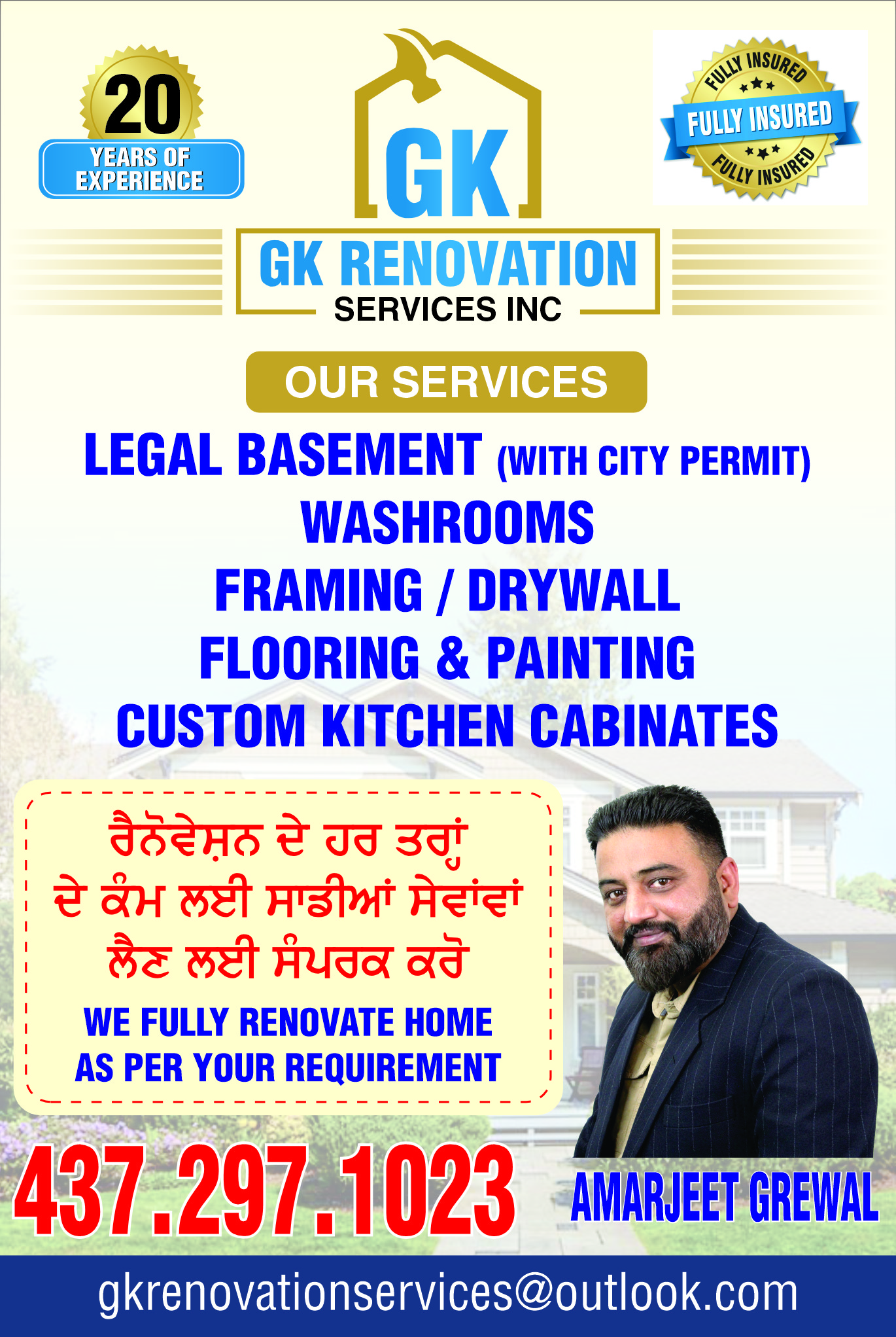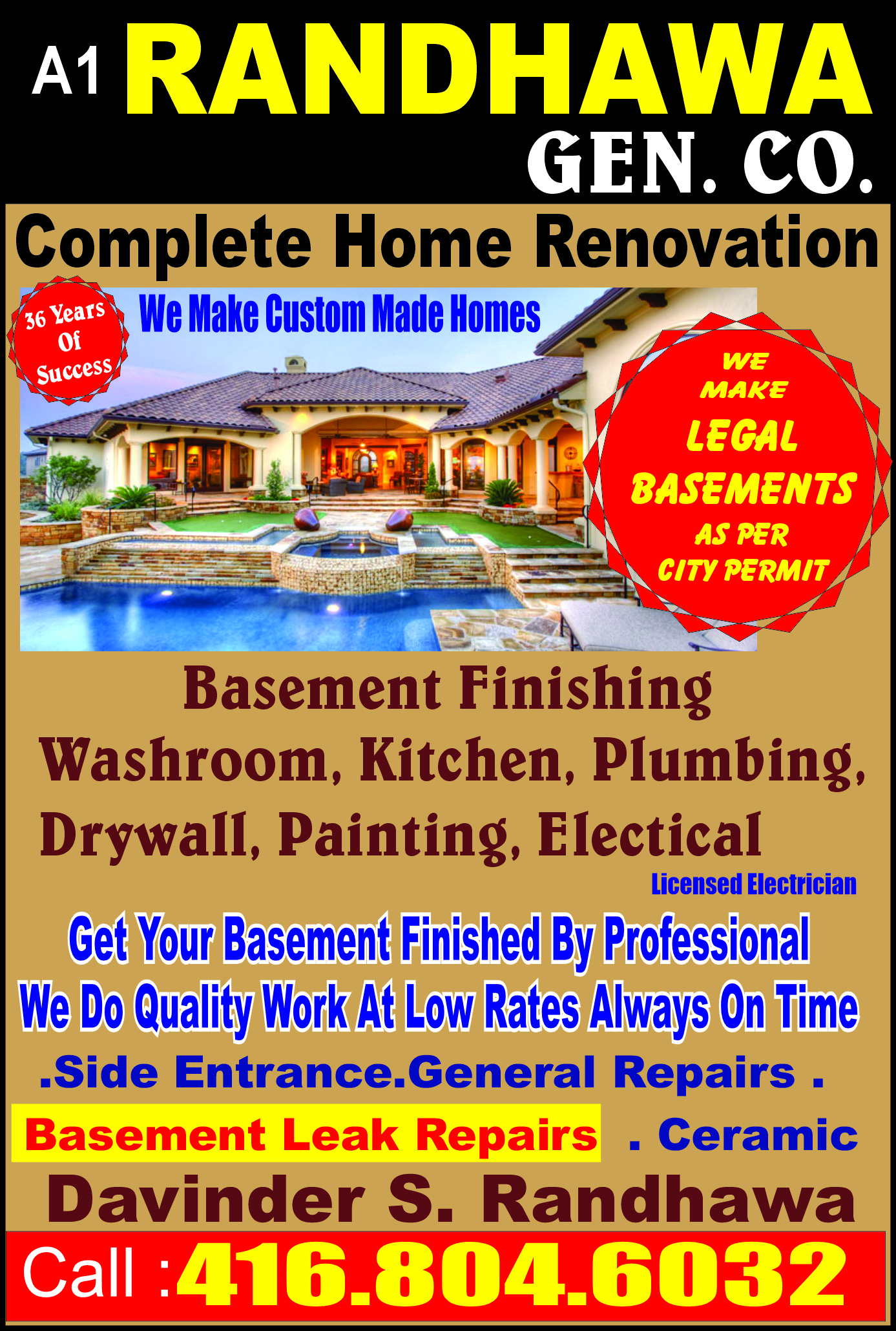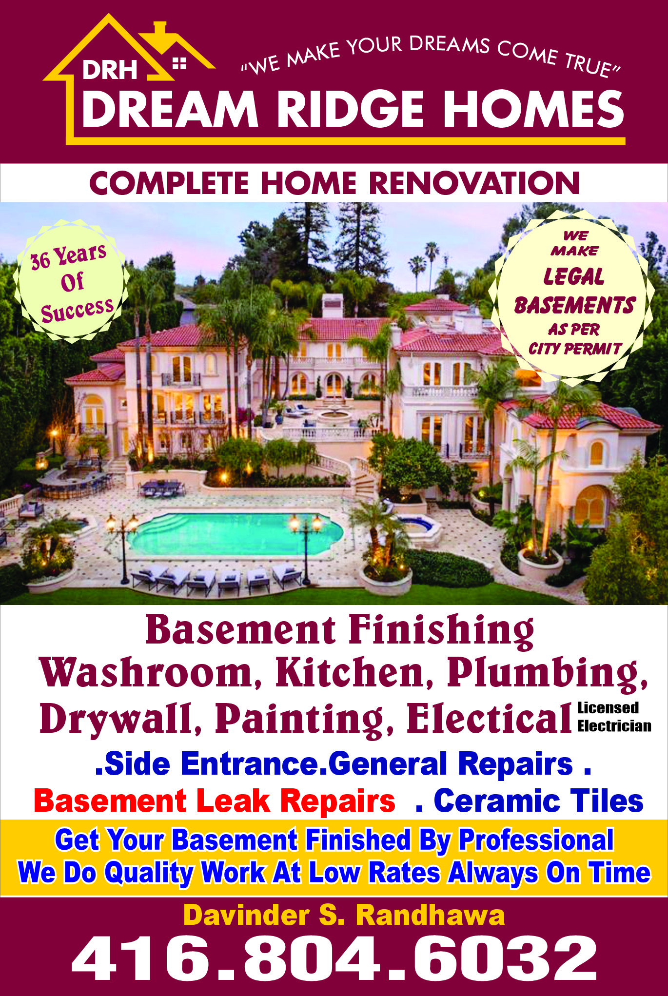Basement Finishing. Drywalls. Taping. Plumbing. Roofing. Electrical. Washrooms. Concrete. Kitchens. painting. Side Entrance. Windows. Ceramic Tiles. Sprinklers. ...