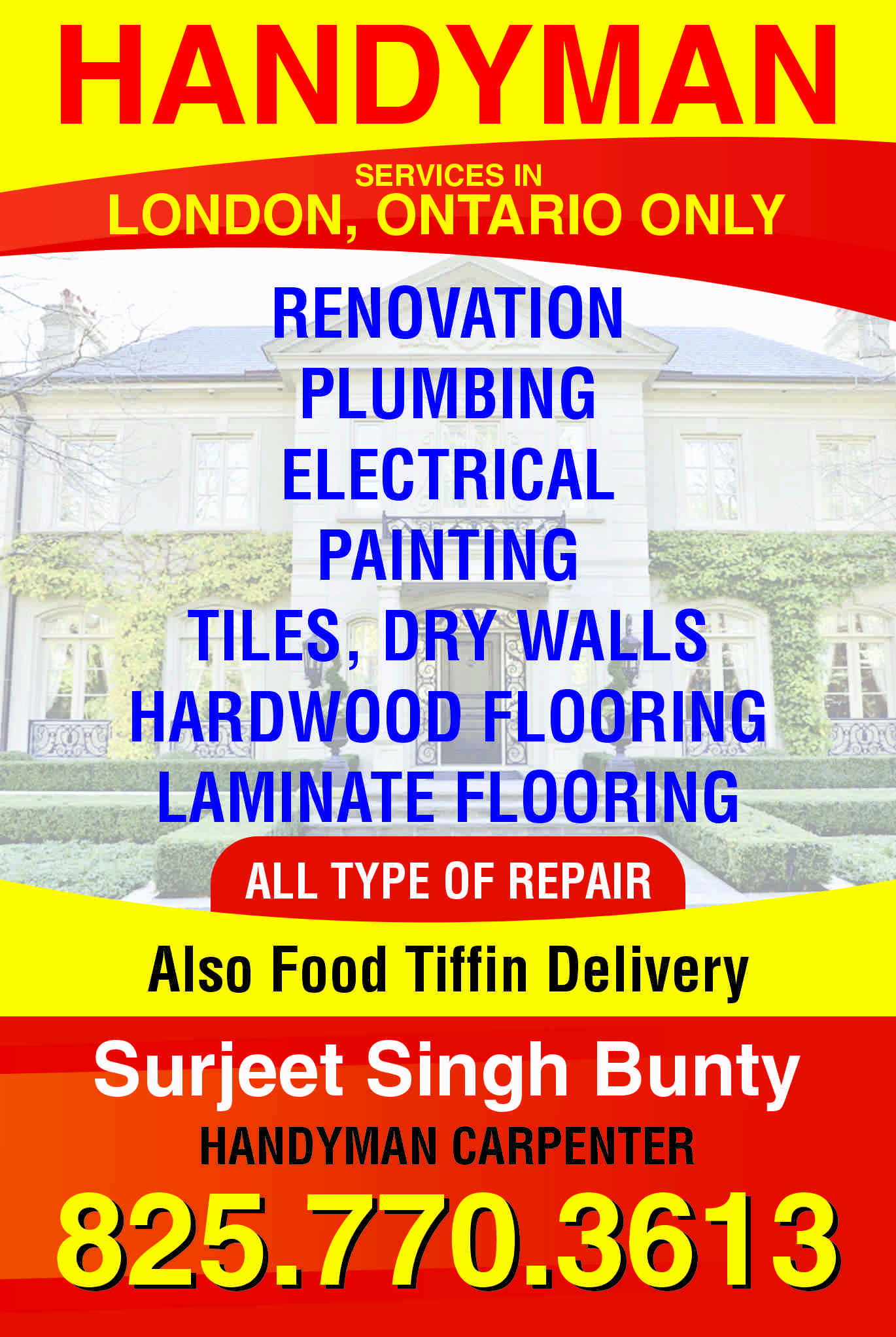 Handyman Services in LONDON, ONTARIO ONLY Renovation, Plumbing, Electrical Painting Tiles Dry Walls Hardwood flooring